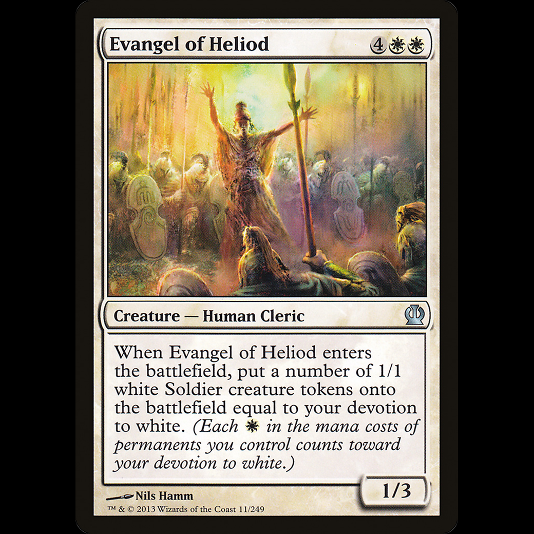 When Evangel of Heliod enters the battlefield, create a number of 1/1 white Soldier creature tokens equal to your devotion to white. (Each in the mana costs of permanents you control counts toward your devotion to white.)