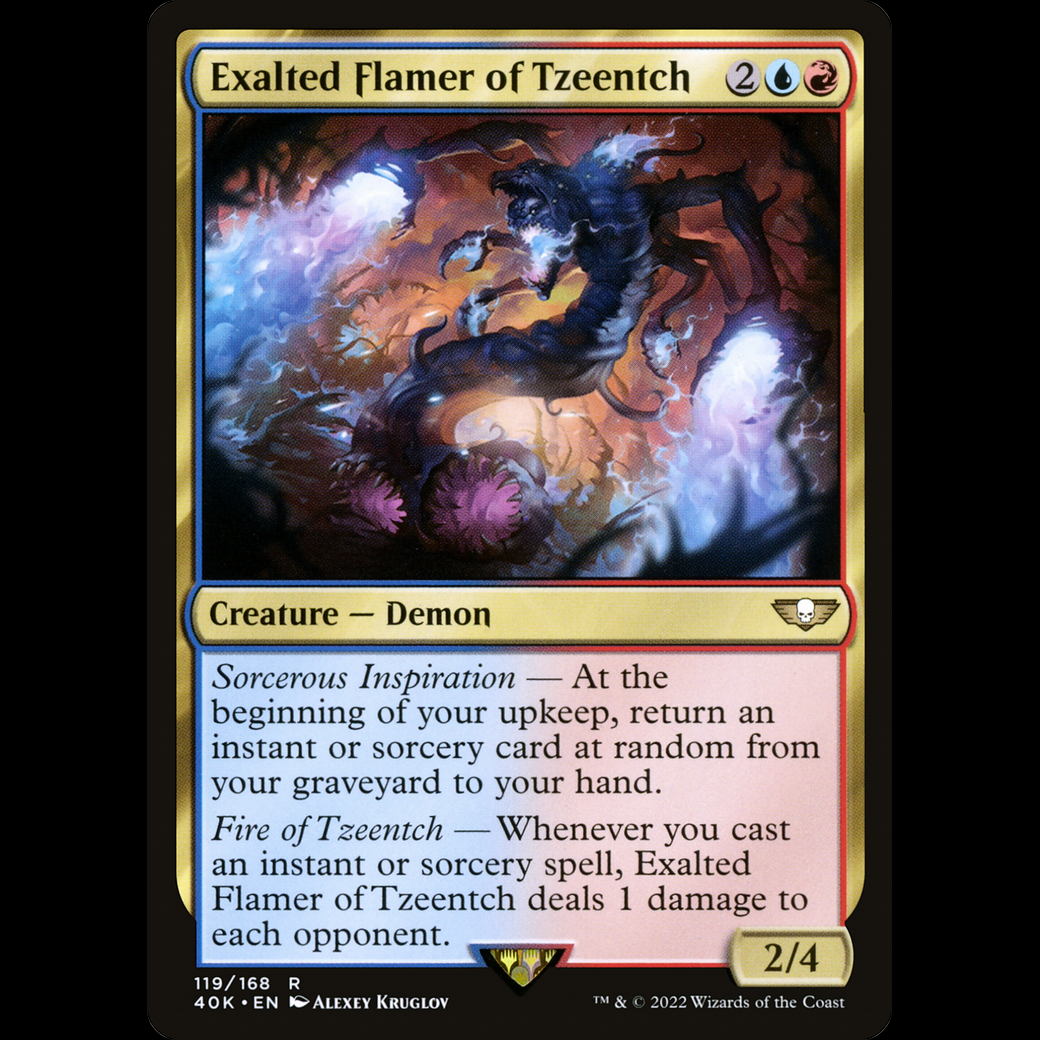MTG Exalted Flamer of Tzeentch Warhammer 40,000 Commander 40k#119 Sorcerous Inspiration — At the beginning of your upkeep, return an instant or sorcery card at random from your graveyard to your hand. Fire of Tzeentch — Whenever you cast an instant or sorcery spell, Exalted Flamer of Tzeentch deals 1 damage to each opponent.