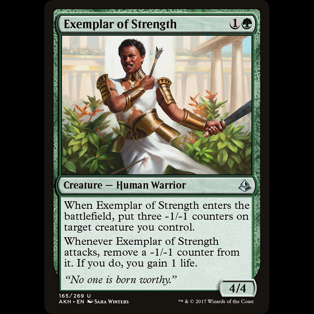 When Exemplar of Strength enters the battlefield, put three -1/-1 counters on target creature you control.