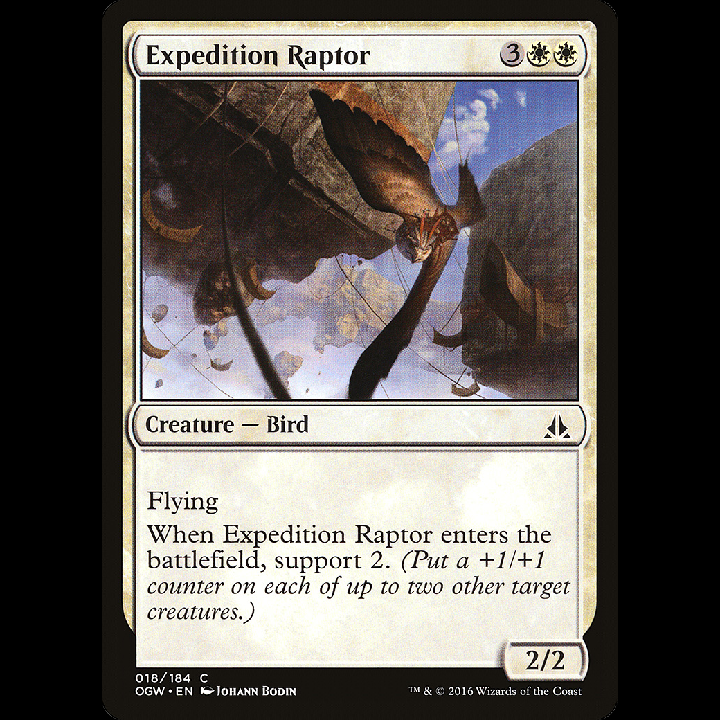 When Expedition Raptor enters the battlefield, support 2. (Put a +1/+1 counter on each of up to two other target creatures.)