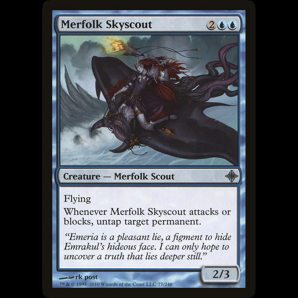 Whenever Merfolk Skyscout attacks or blocks, untap target permanent.