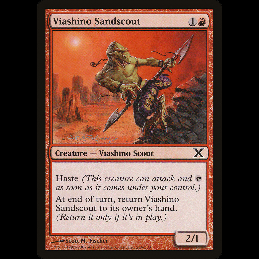 At the beginning of the end step, return Viashino Sandscout to its owner's hand. (Return it only if it's on the battlefield.)