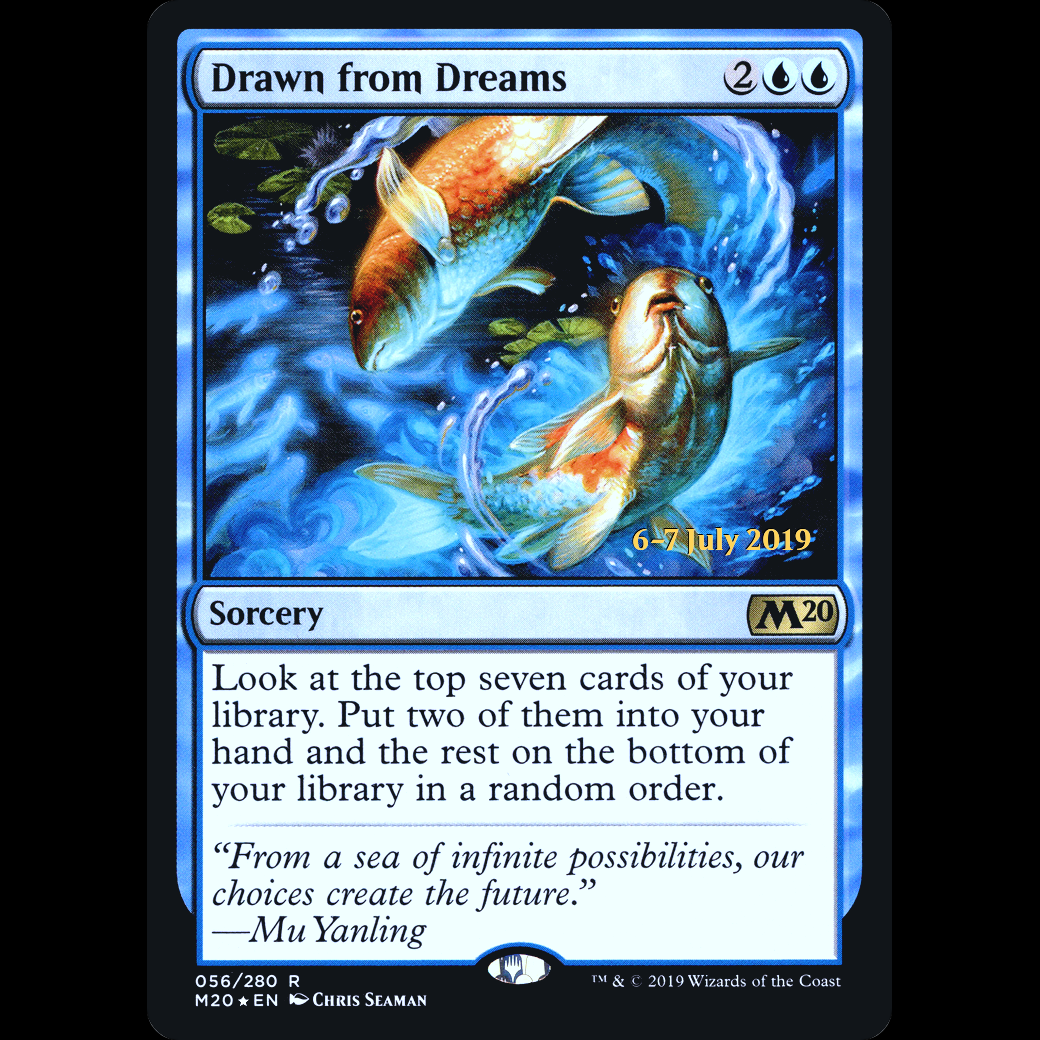 MTG Extraer de los sueños (Drawn from Dreams) Core Set 2020 Promos pm20#56s Look at the top seven cards of your library. Put two of them into your hand and the rest on the bottom of your library in a random order.