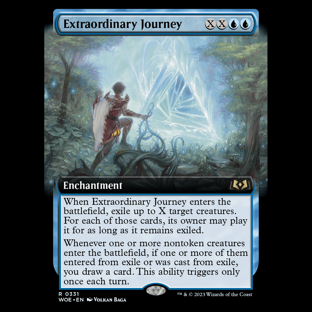 When Extraordinary Journey enters the battlefield, exile up to X target creatures. For each of those cards, its owner may play it for as long as it remains exiled.