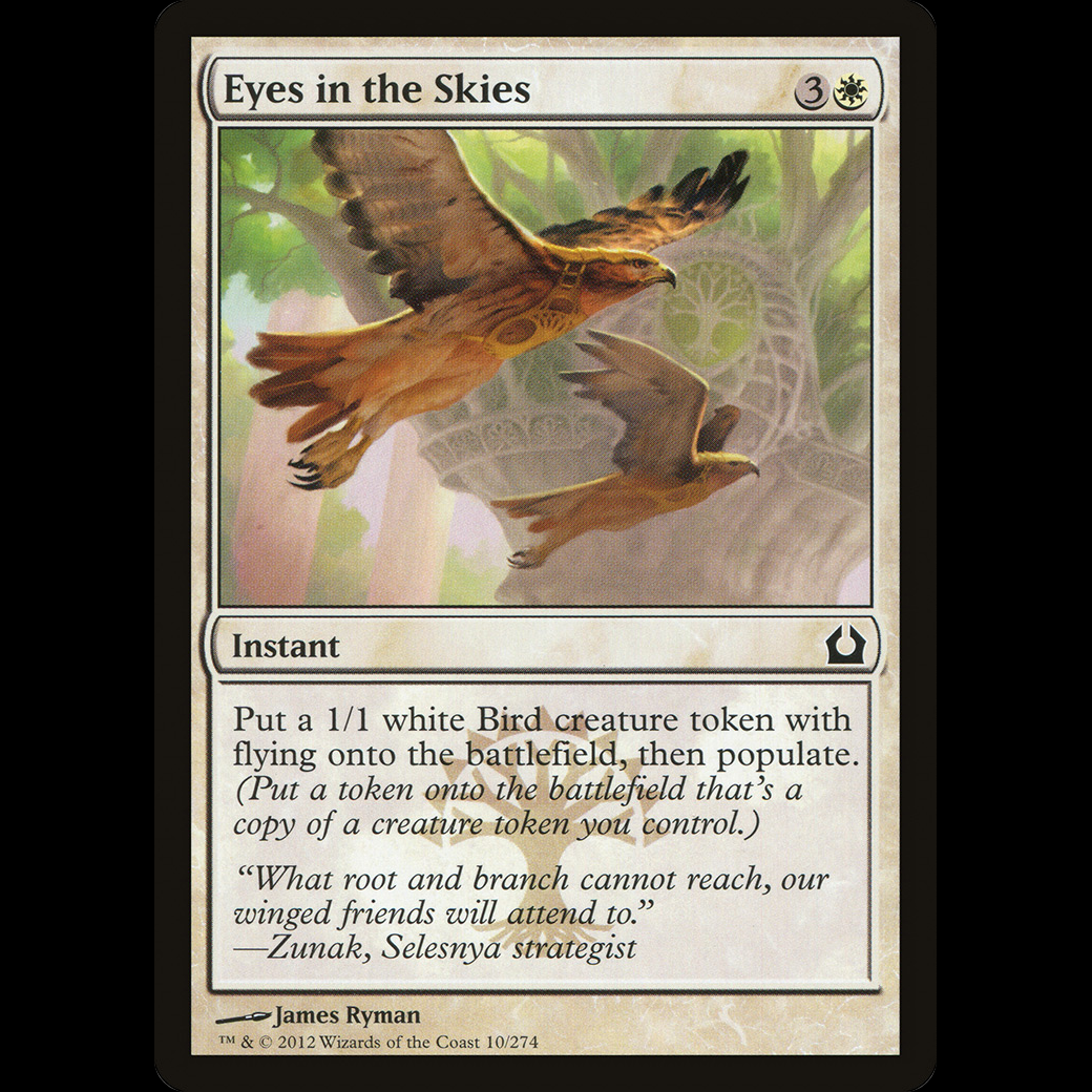 Create a 1/1 white Bird creature token with flying, then populate. (Create a token that's a copy of a creature token you control.)