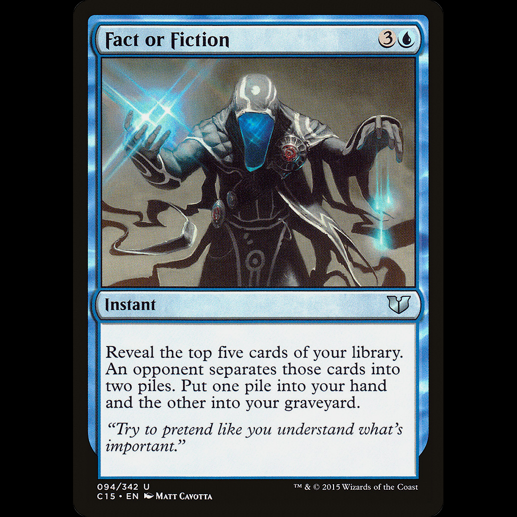 Reveal the top five cards of your library. An opponent separates those cards into two piles. Put one pile into your hand and the other into your graveyard.