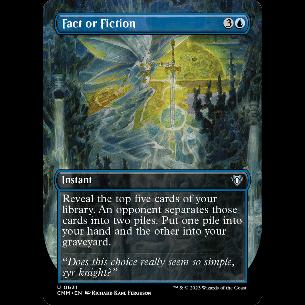 Reveal the top five cards of your library. An opponent separates those cards into two piles. Put one pile into your hand and the other into your graveyard.