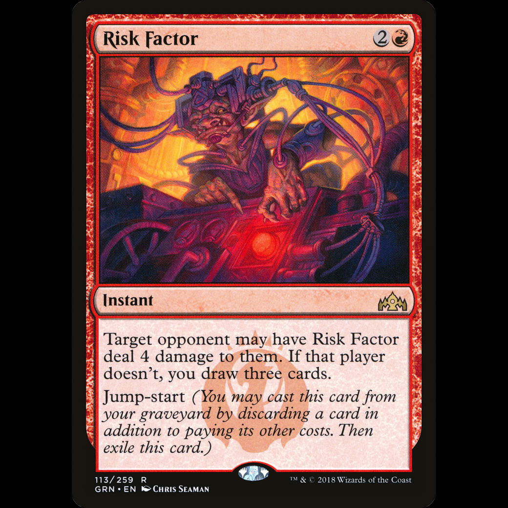 Target opponent may have Risk Factor deal 4 damage to them. If that player doesn't, you draw three cards.