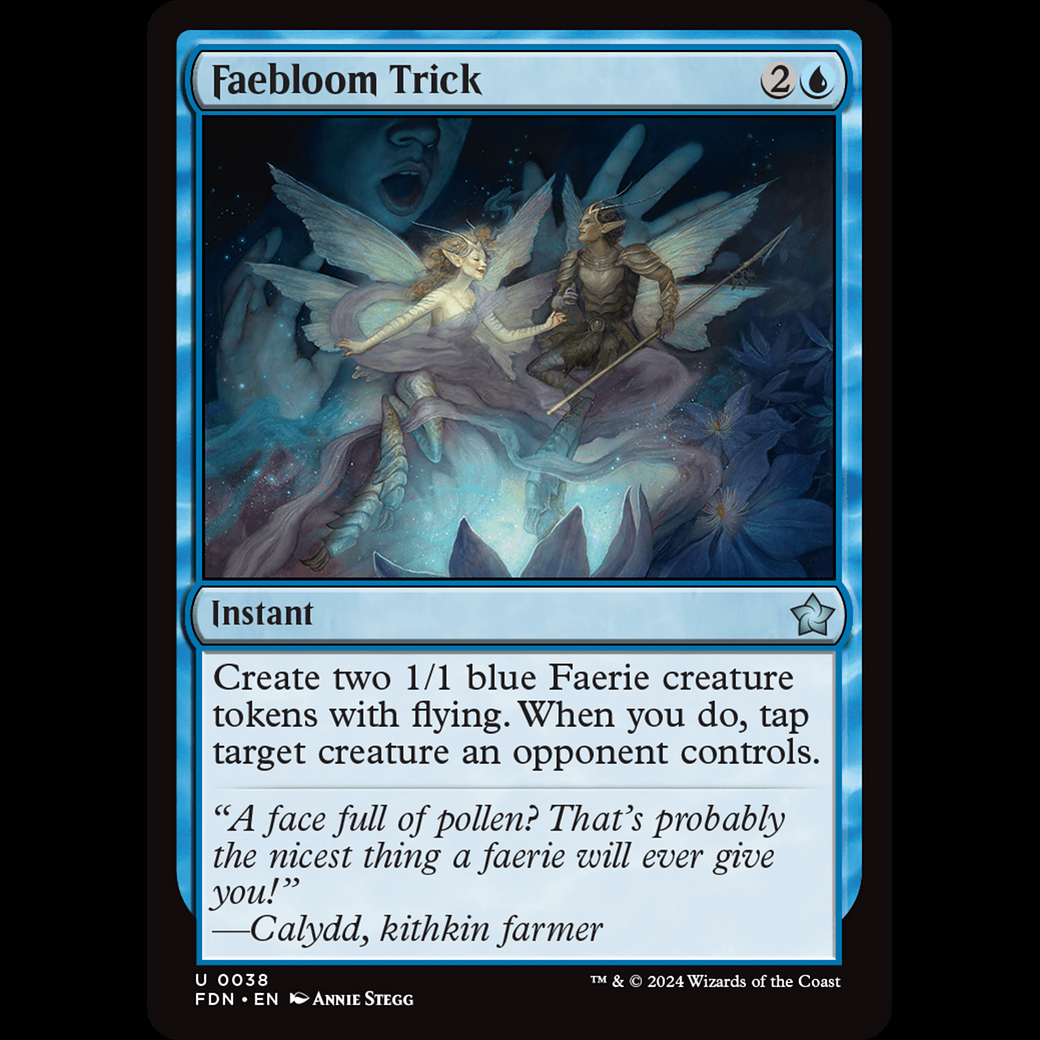 Create two 1/1 blue Faerie creature tokens with flying. When you do, tap target creature an opponent controls.