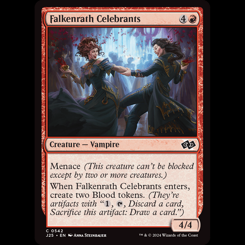When Falkenrath Celebrants enters, create two Blood tokens. (They're artifacts with ", , Discard a card, Sacrifice this artifact: Draw a card.")