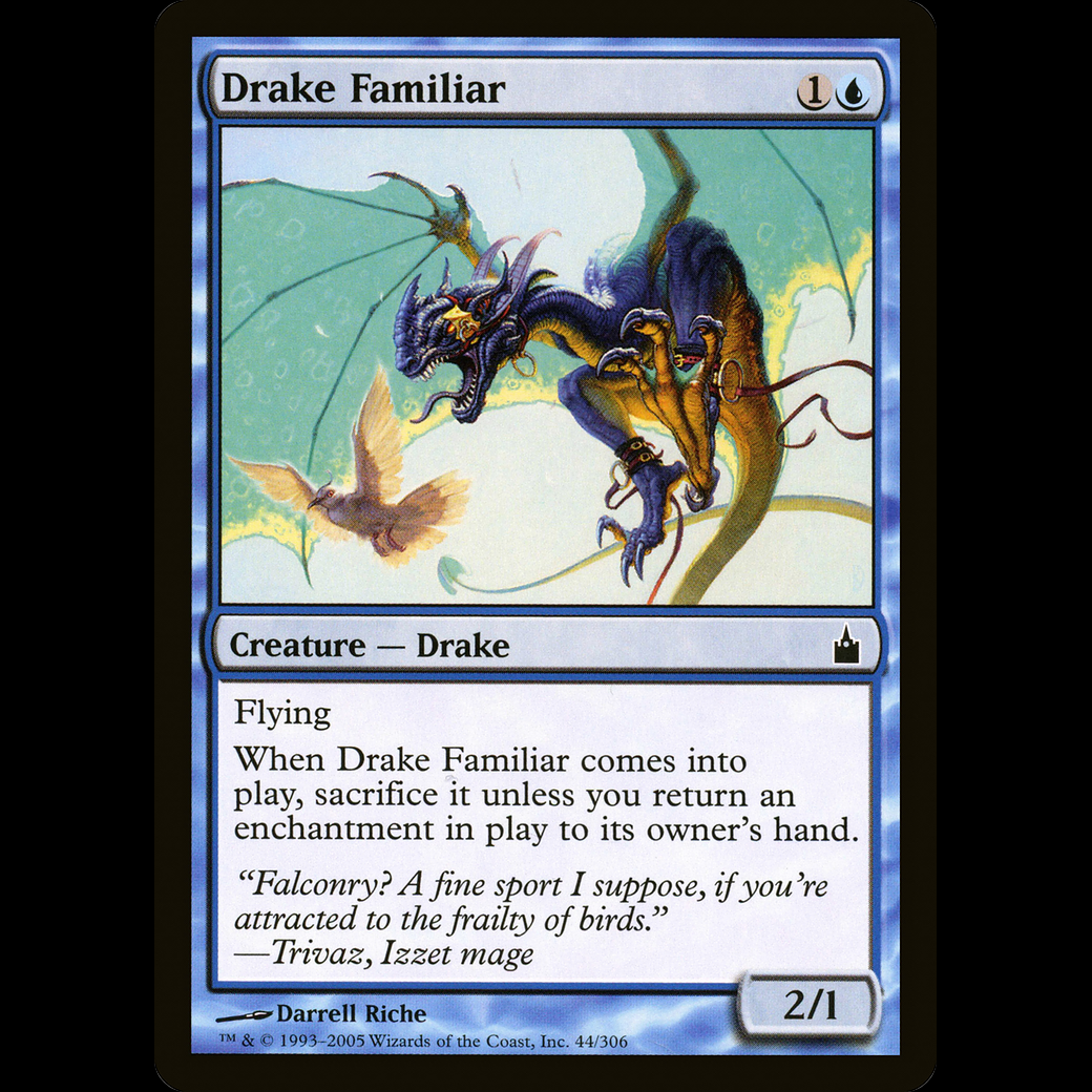 When Drake Familiar enters the battlefield, sacrifice it unless you return an enchantment to its owner's hand.