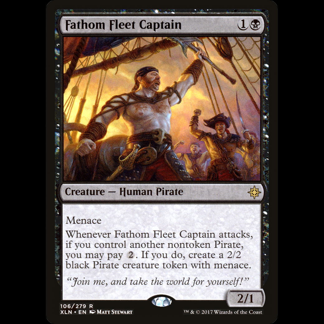 Whenever Fathom Fleet Captain attacks, if you control another nontoken Pirate, you may pay . If you do, create a 2/2 black Pirate creature token with menace.