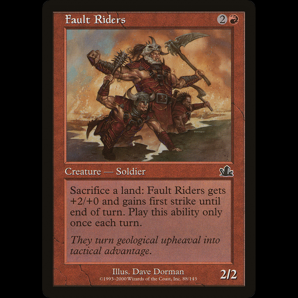 Sacrifice a land: Fault Riders gets +2/+0 and gains first strike until end of turn. Activate only once each turn.