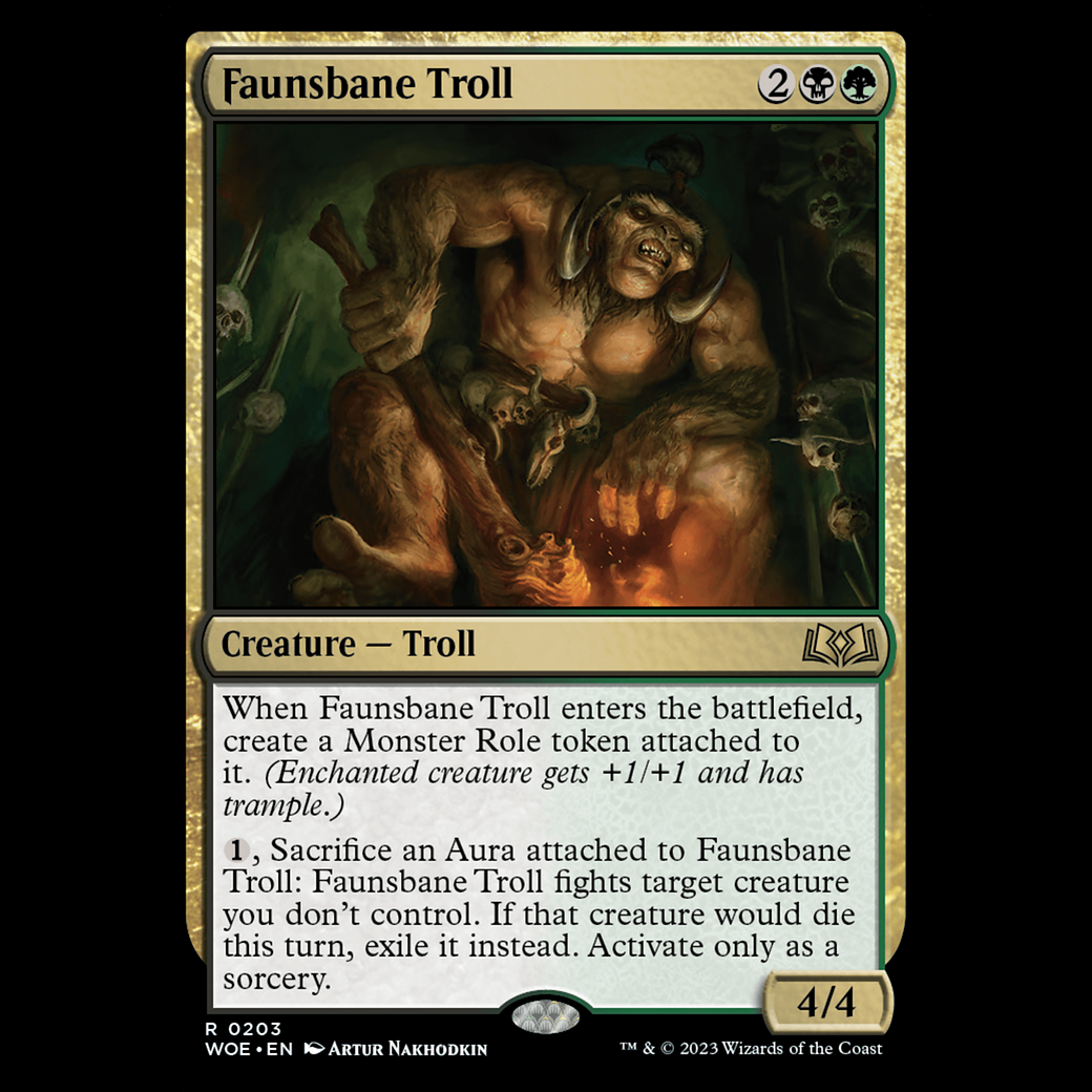 When Faunsbane Troll enters the battlefield, create a Monster Role token attached to it. (Enchanted creature gets +1/+1 and has trample.)