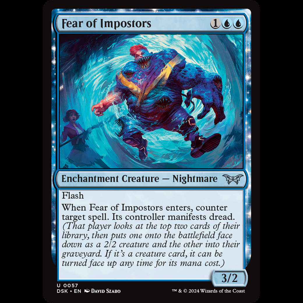 When Fear of Impostors enters, counter target spell. Its controller manifests dread. (That player looks at the top two cards of their library, then puts one onto the battlefield face down as a 2/2 creature and the other into their graveyard. If it's a creature card, it can be turned face up any time for its mana cost.)