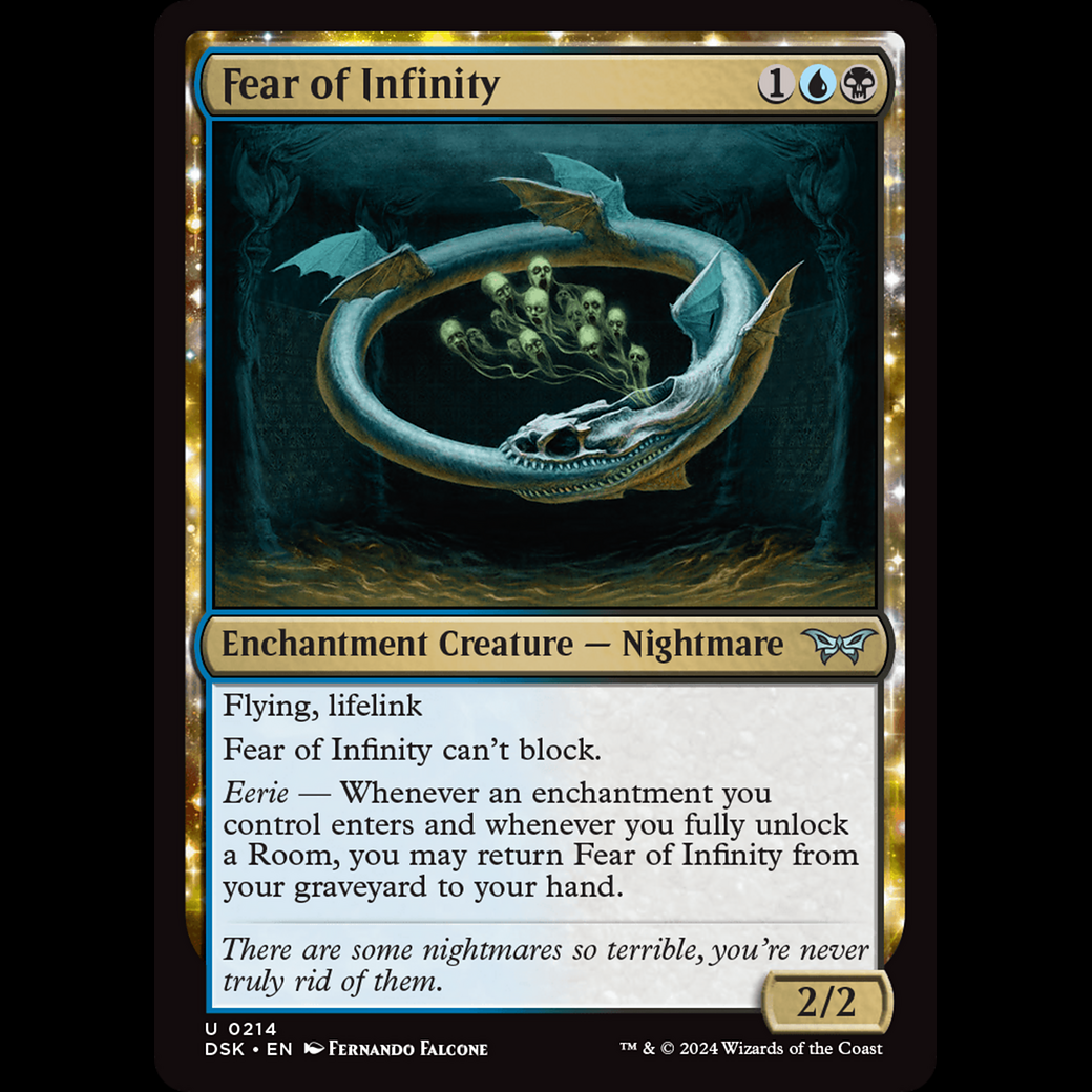 Eerie — Whenever an enchantment you control enters and whenever you fully unlock a Room, you may return Fear of Infinity from your graveyard to your hand.