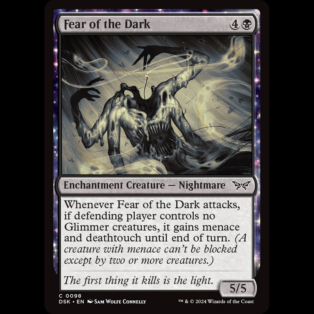 Whenever Fear of the Dark attacks, if defending player controls no Glimmer creatures, it gains menace and deathtouch until end of turn. (A creature with menace can't be blocked except by two or more creatures.)