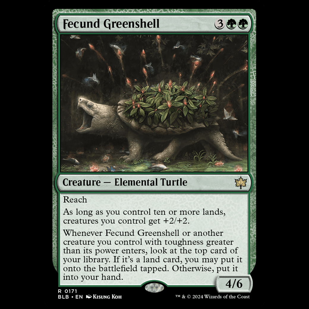 Whenever Fecund Greenshell or another creature you control with toughness greater than its power enters, look at the top card of your library. If it's a land card, you may put it onto the battlefield tapped. Otherwise, put it into your hand.