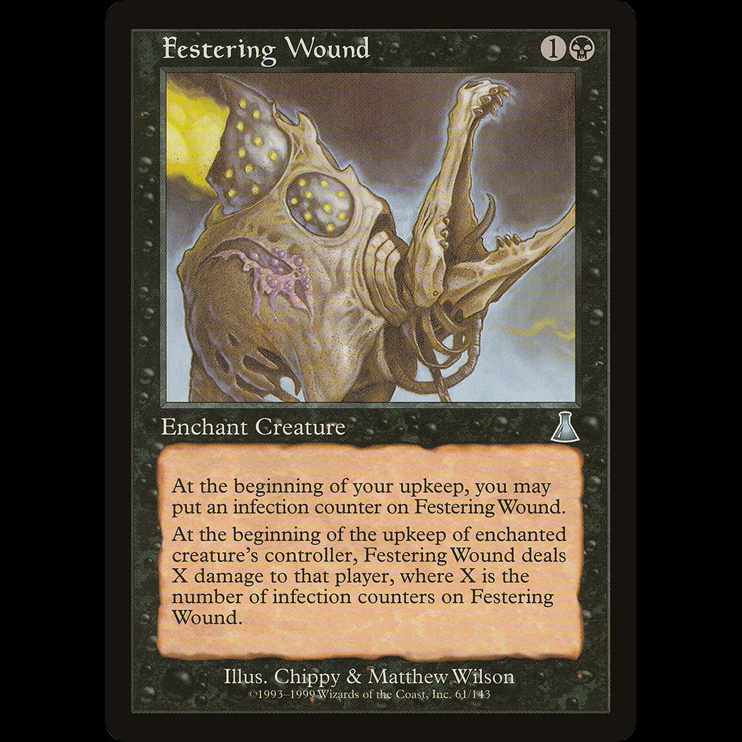 At the beginning of the upkeep of enchanted creature's controller, Festering Wound deals X damage to that player, where X is the number of infection counters on Festering Wound.