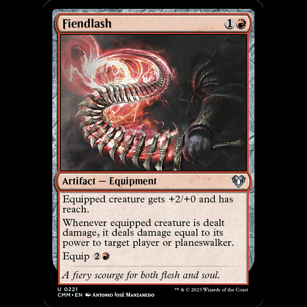 Whenever equipped creature is dealt damage, it deals damage equal to its power to target player or planeswalker.