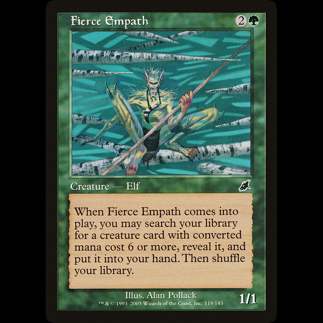 When Fierce Empath enters the battlefield, you may search your library for a creature card with mana value 6 or greater, reveal it, put it into your hand, then shuffle.
