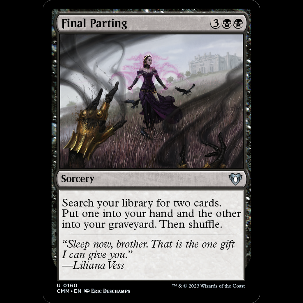 Search your library for two cards. Put one into your hand and the other into your graveyard. Then shuffle.