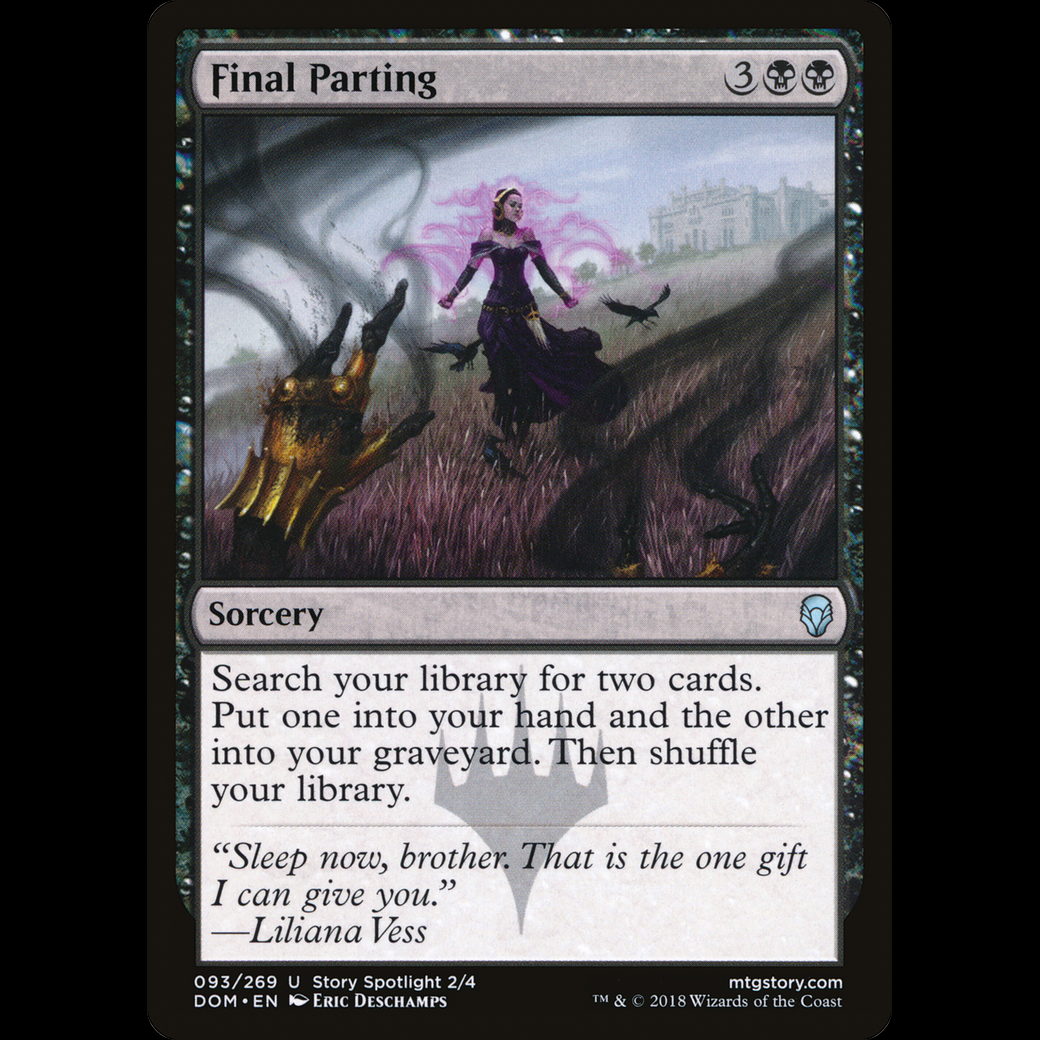 Search your library for two cards. Put one into your hand and the other into your graveyard. Then shuffle.