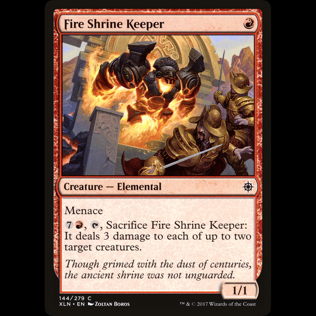 , , Sacrifice Fire Shrine Keeper: It deals 3 damage to each of up to two target creatures.