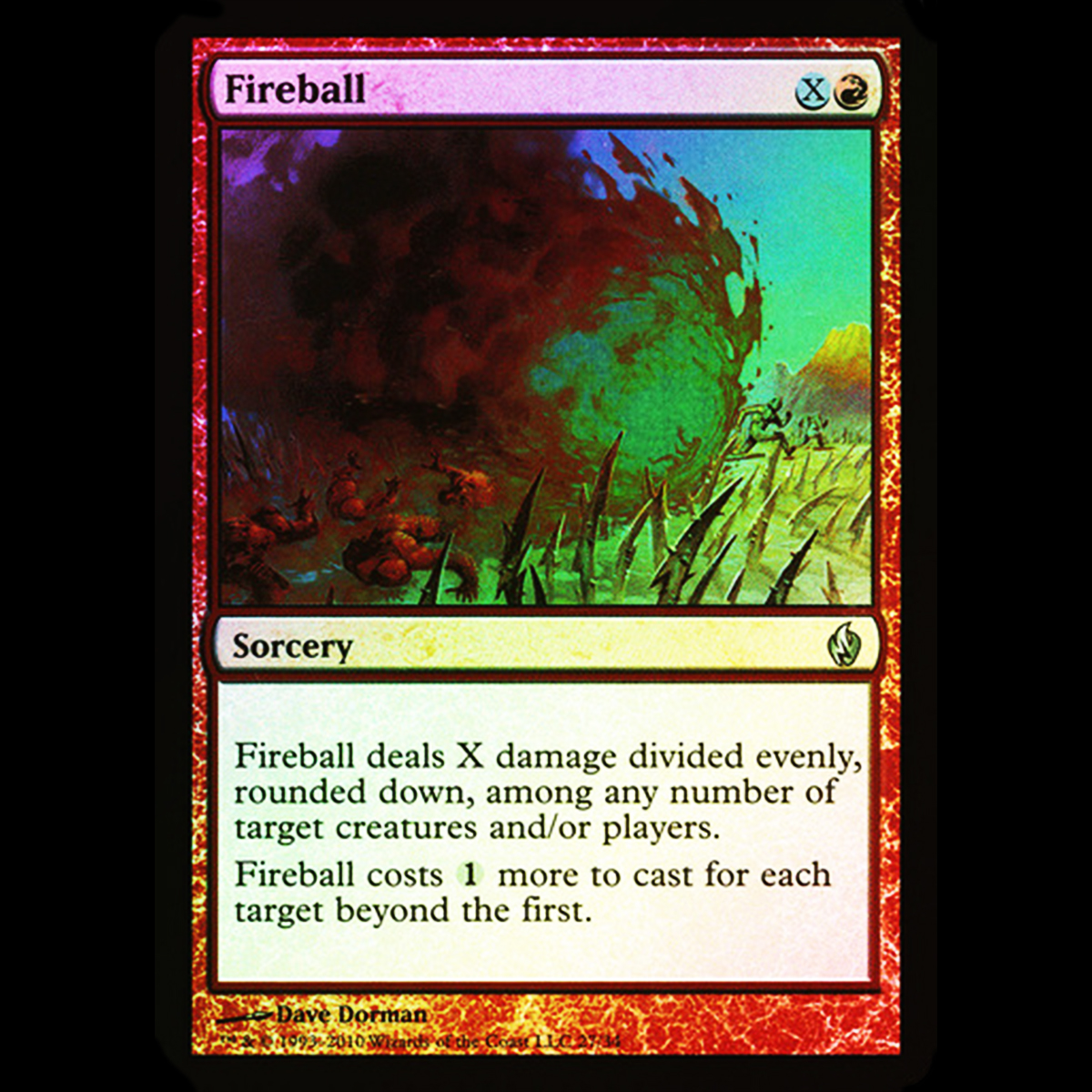 Fireball deals X damage divided evenly, rounded down, among any number of targets.