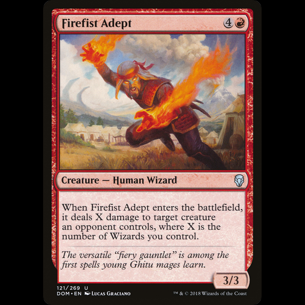 When Firefist Adept enters the battlefield, it deals X damage to target creature an opponent controls, where X is the number of Wizards you control.