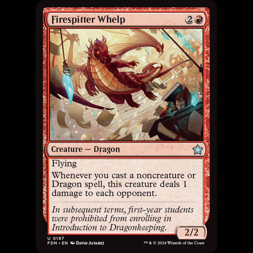 Whenever you cast a noncreature or Dragon spell, Firespitter Whelp deals 1 damage to each opponent.