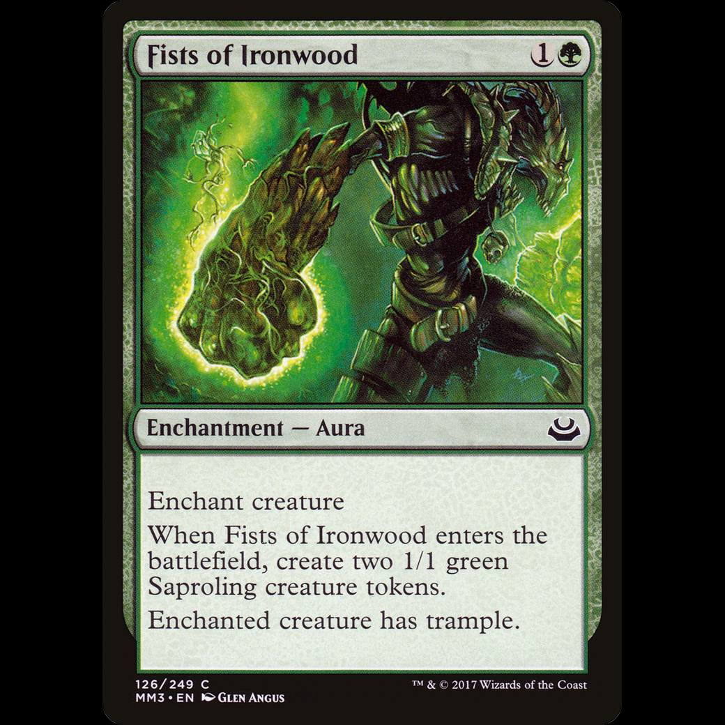 When Fists of Ironwood enters the battlefield, create two 1/1 green Saproling creature tokens.