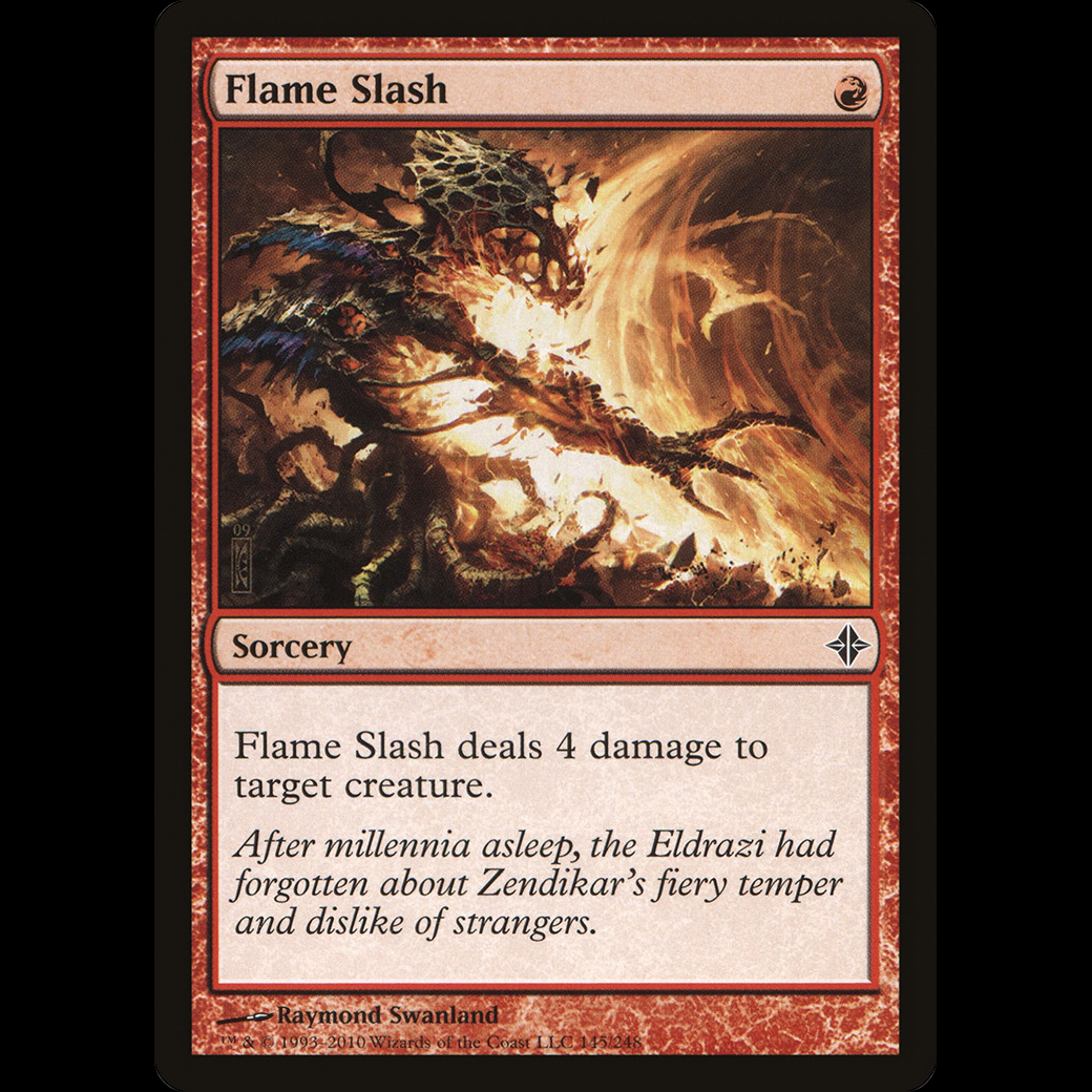 MTG Flame Slash Rise of the EldraziFlame Slash deals 4 damage to target creature.