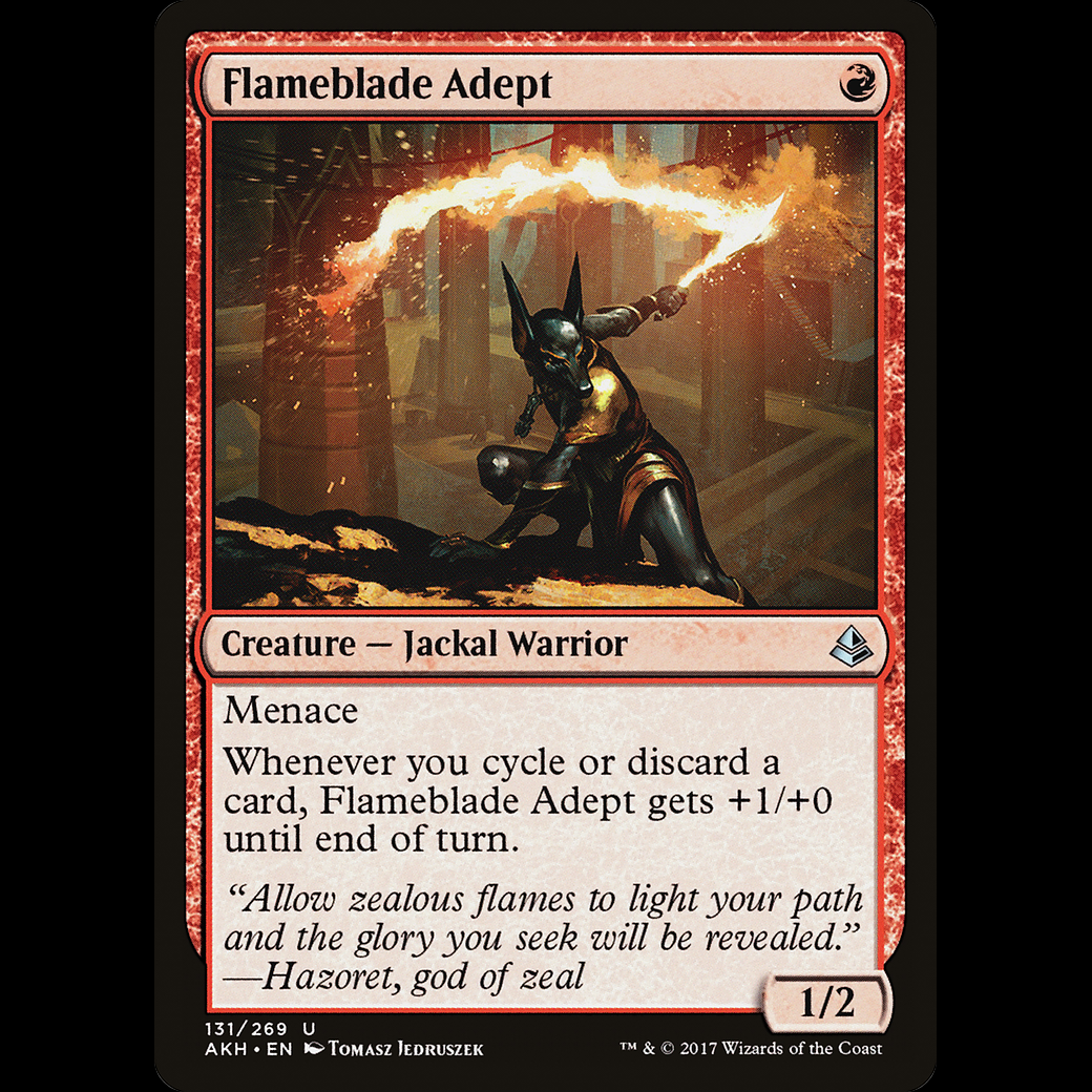 Whenever you cycle or discard a card, Flameblade Adept gets +1/+0 until end of turn.