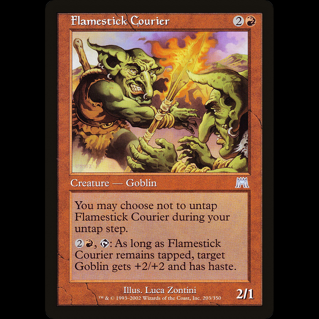 , : Target Goblin creature gets +2/+2 and has haste for as long as Flamestick Courier remains tapped.
