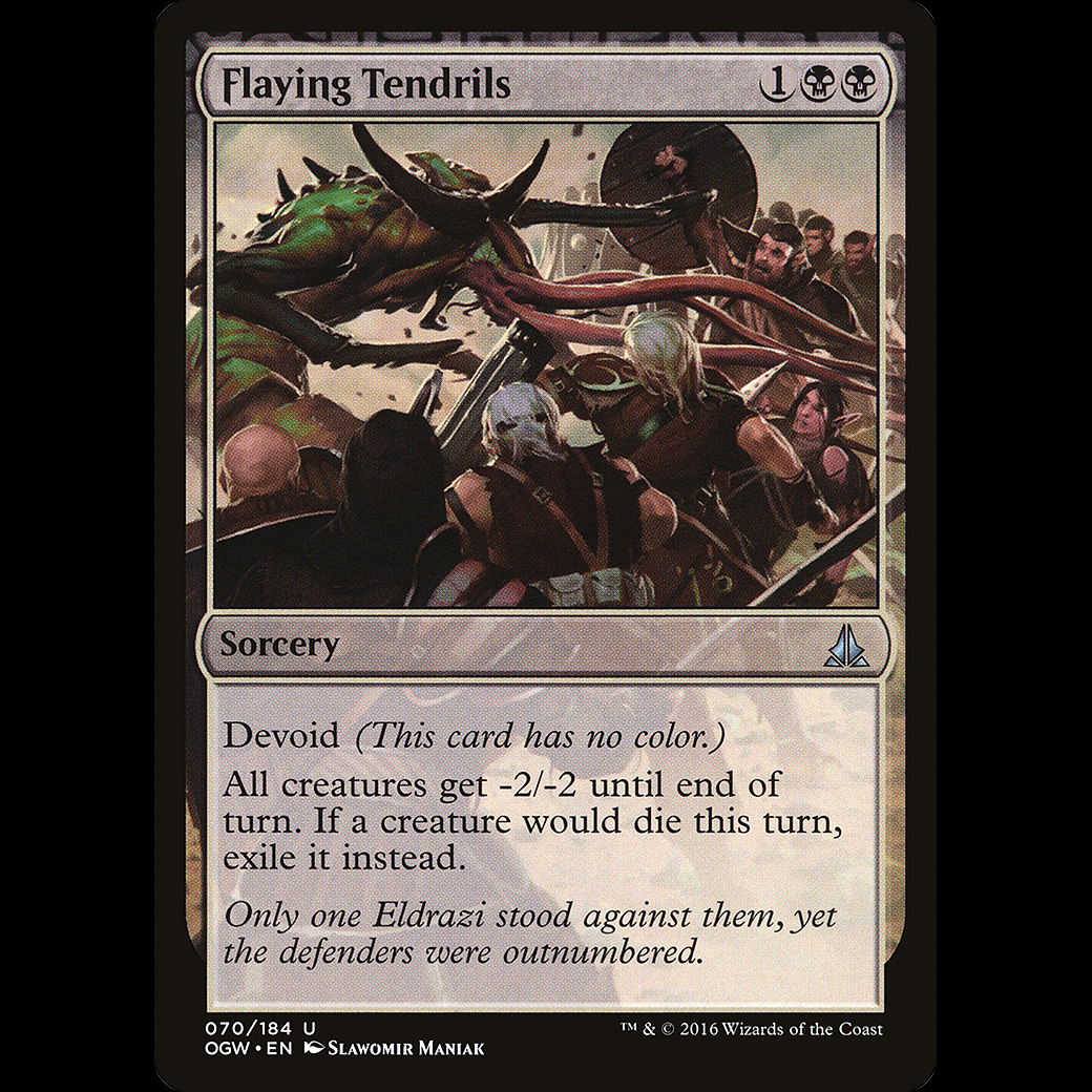 MTG Flaying Tendrils Oath of the GatewatchDevoid (This card has no color.) All creatures get -2/-2 until end of turn. If a creature would die this turn, exile it instead.