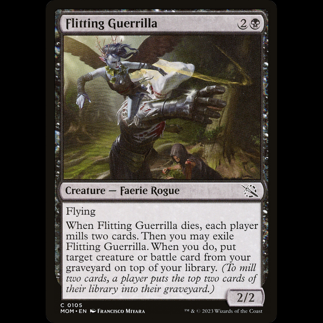 When Flitting Guerrilla dies, each player mills two cards. Then you may exile Flitting Guerrilla. When you do, put target creature or battle card from your graveyard on top of your library. (To mill two cards, a player puts the top two cards of their library into their graveyard.)