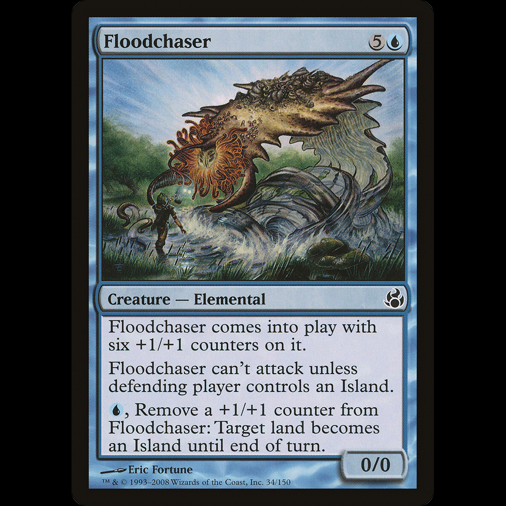 , Remove a +1/+1 counter from Floodchaser: Target land becomes an Island until end of turn.