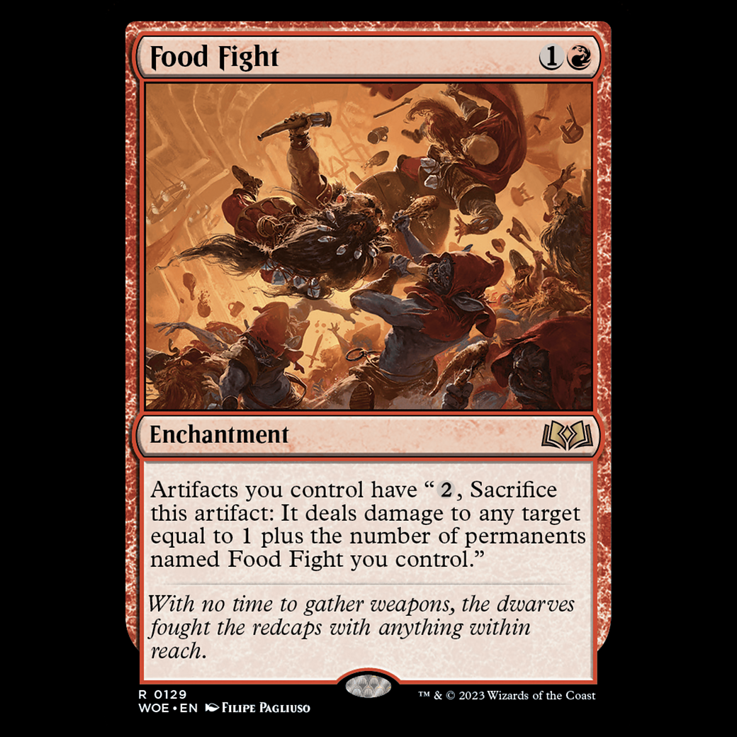 Artifacts you control have ", Sacrifice this artifact: It deals damage to any target equal to 1 plus the number of permanents named Food Fight you control."