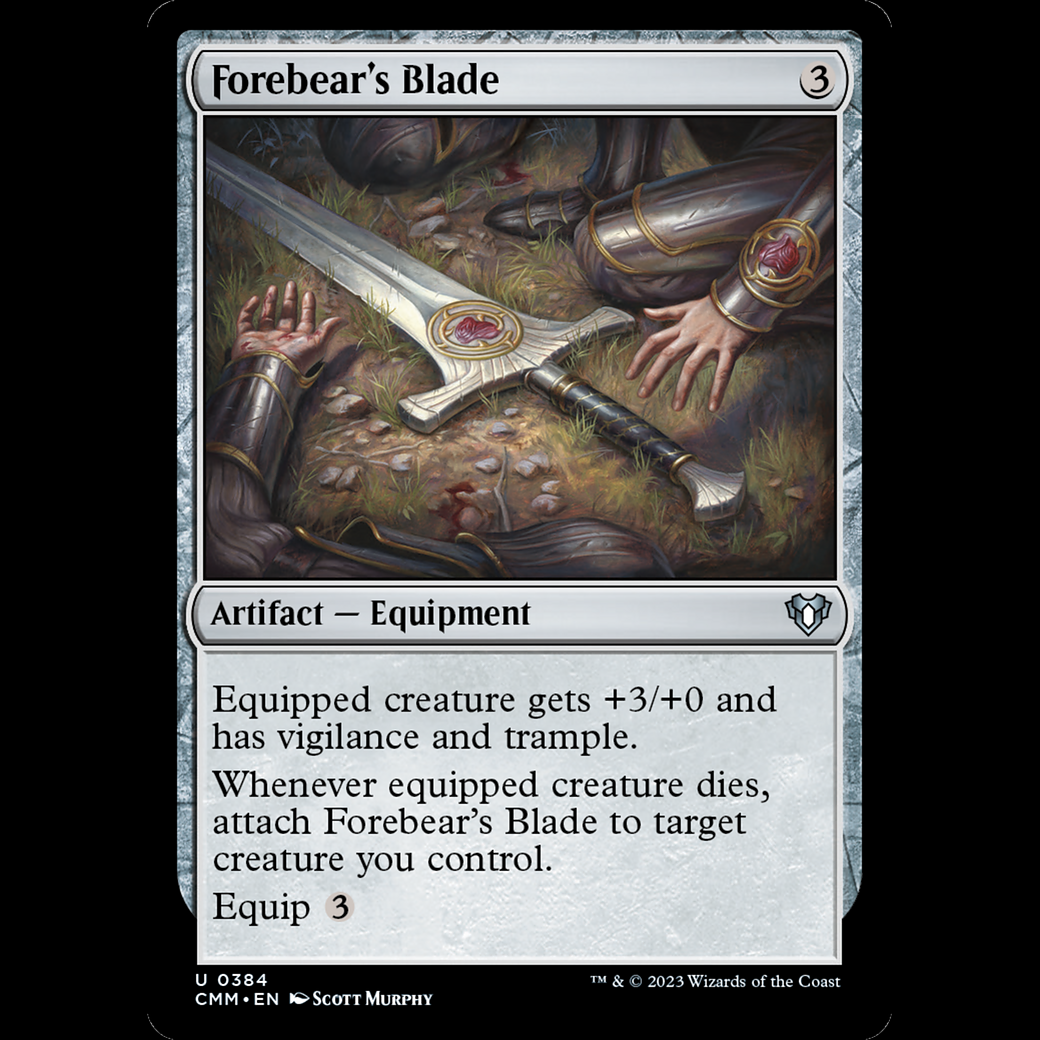 Whenever equipped creature dies, attach Forebear's Blade to target creature you control.