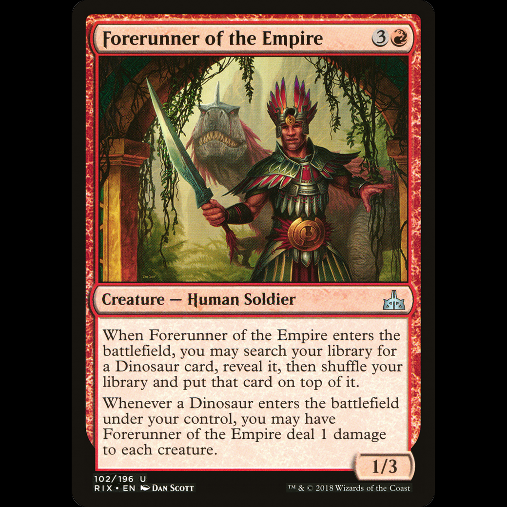 When Forerunner of the Empire enters the battlefield, you may search your library for a Dinosaur card, reveal it, then shuffle and put that card on top.