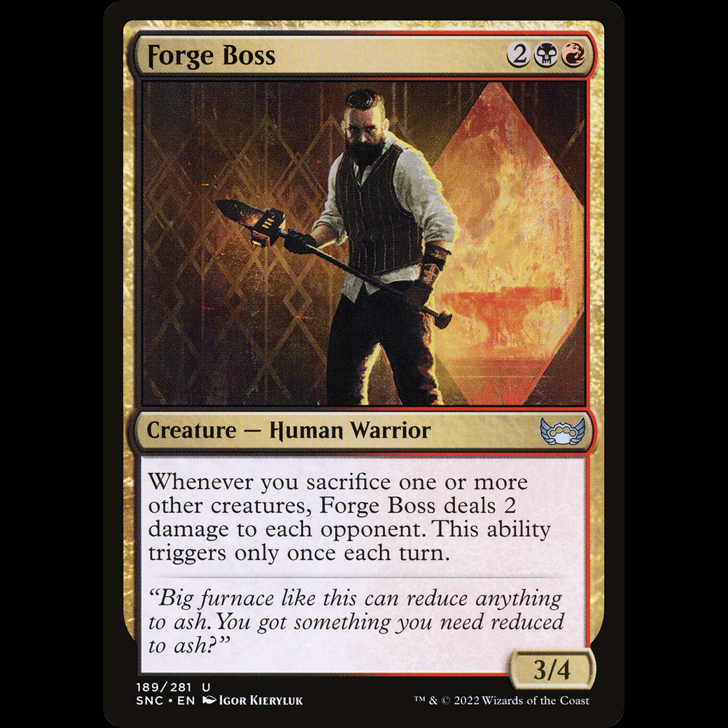 Whenever you sacrifice one or more other creatures, this creature deals 2 damage to each opponent. This ability triggers only once each turn.