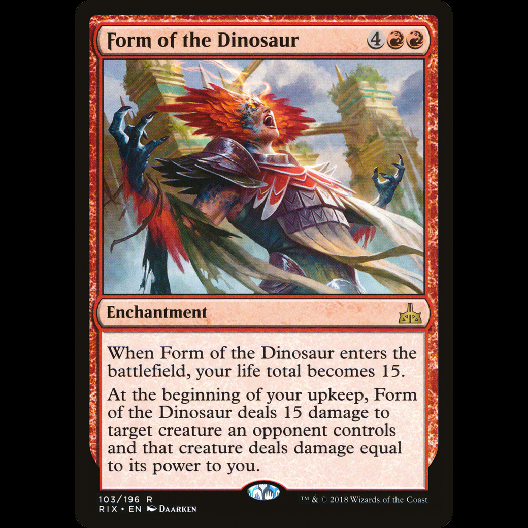 When Form of the Dinosaur enters the battlefield, your life total becomes 15.