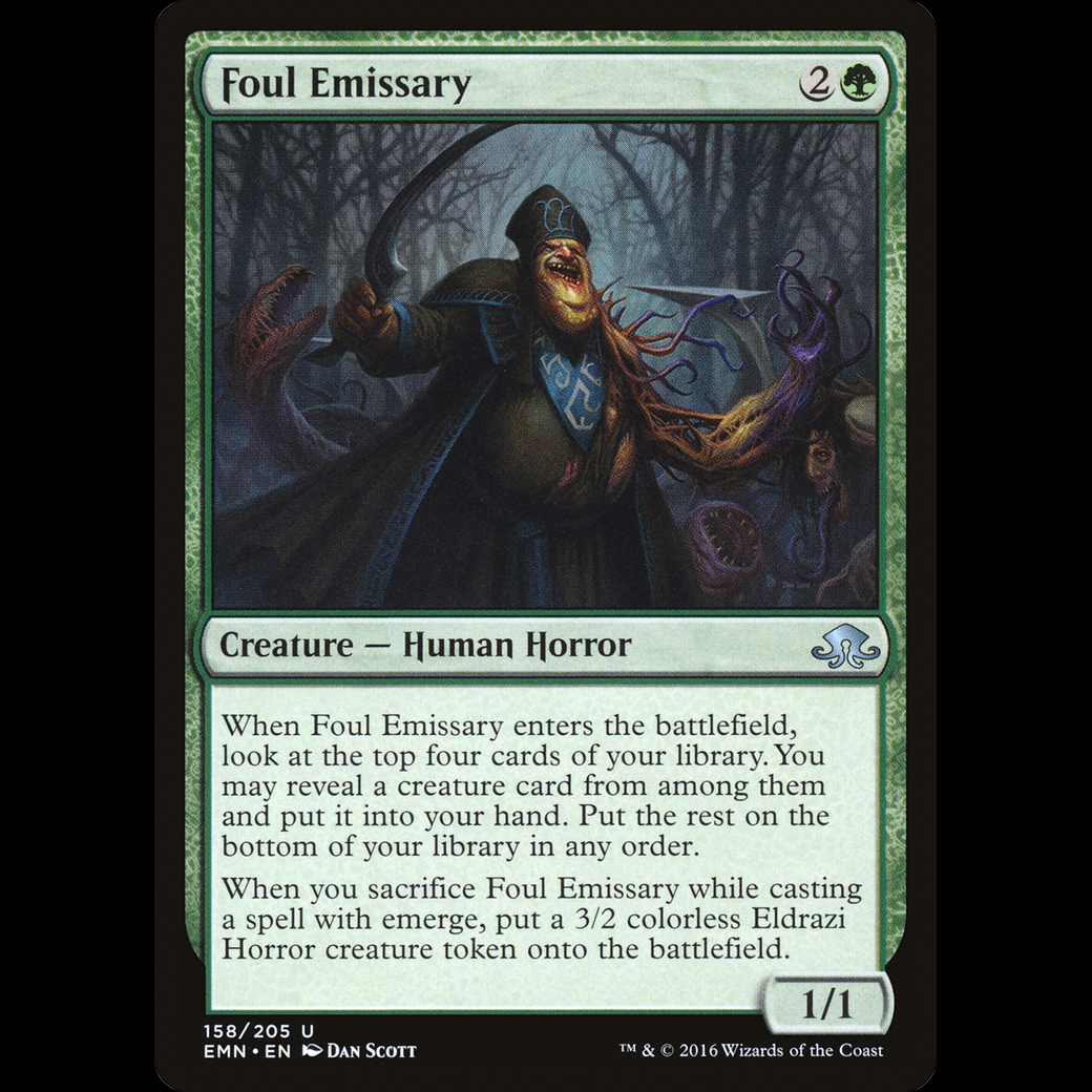 When you sacrifice Foul Emissary while casting a spell with emerge, create a 3/2 colorless Eldrazi Horror creature token.