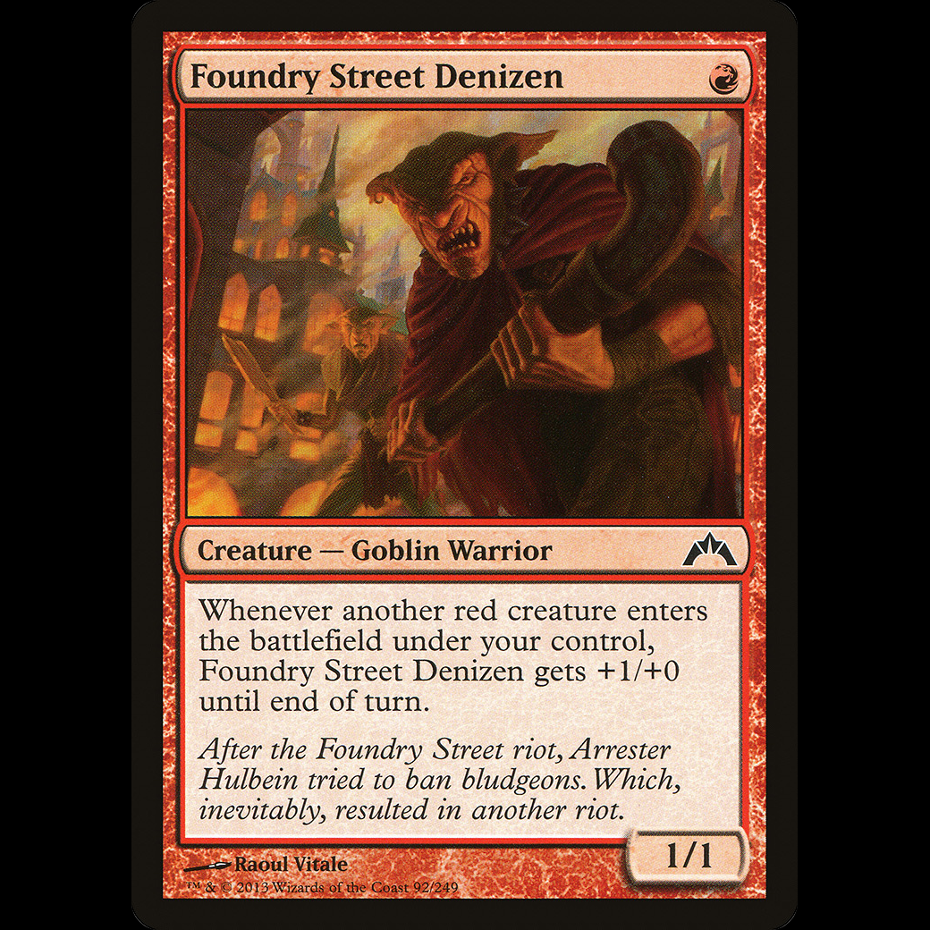 Whenever another red creature enters the battlefield under your control, Foundry Street Denizen gets +1/+0 until end of turn.