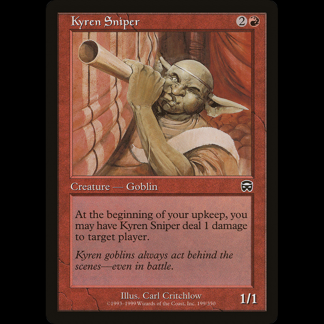 At the beginning of your upkeep, you may have Kyren Sniper deal 1 damage to target player or planeswalker.