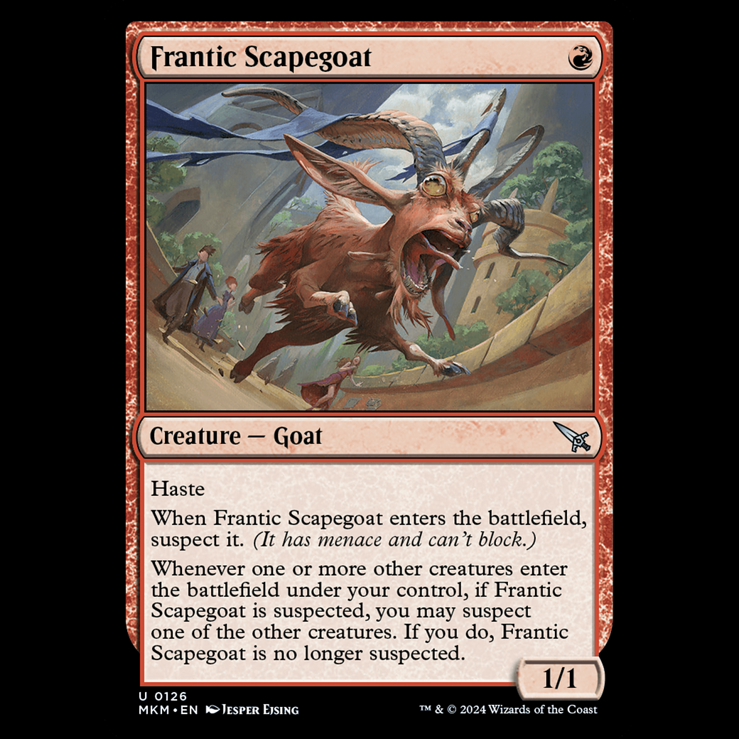 Whenever one or more other creatures enter the battlefield under your control, if Frantic Scapegoat is suspected, you may suspect one of the other creatures. If you do, Frantic Scapegoat is no longer suspected.