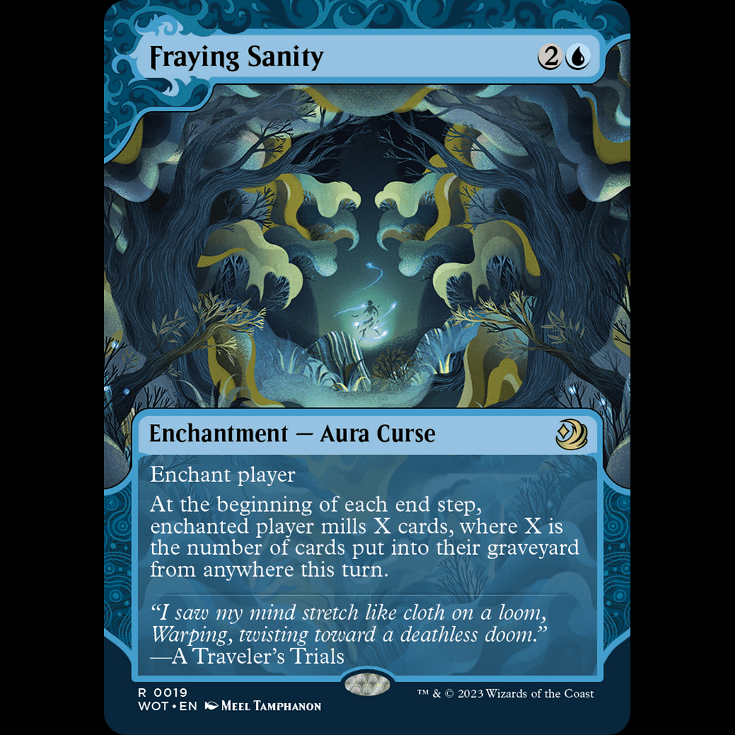 MTG Fraying Sanity Wilds of Eldraine: Enchanting Tales wot#19Enchant player At the beginning of each end step, enchanted player mills X cards, where X is the number of cards put into their graveyard from anywhere this turn.