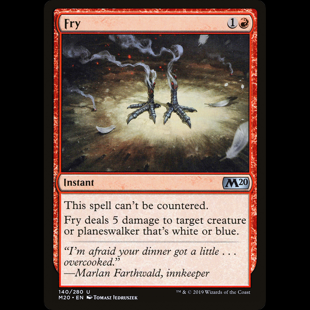 Fry deals 5 damage to target creature or planeswalker that's white or blue.