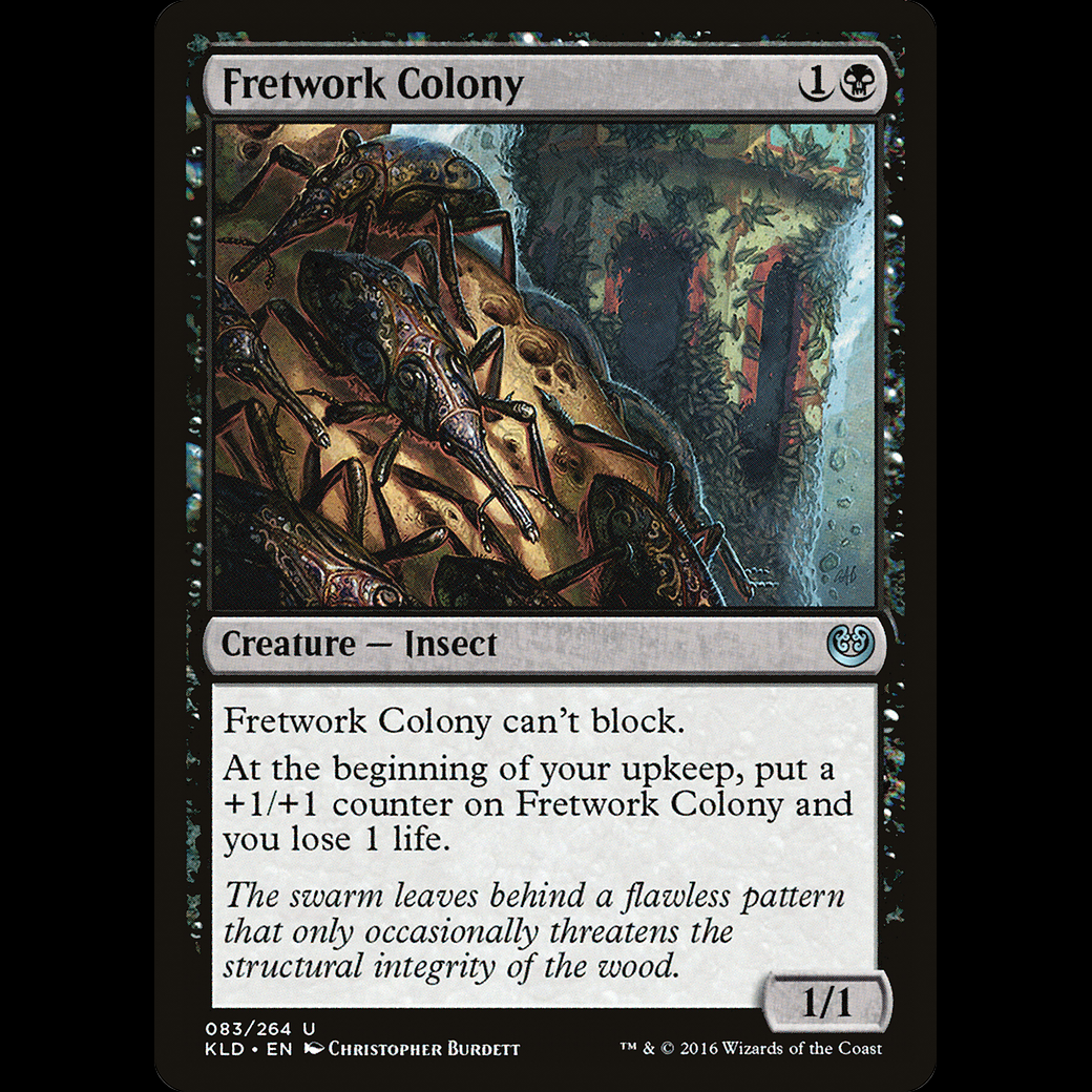At the beginning of your upkeep, put a +1/+1 counter on Fretwork Colony and you lose 1 life.